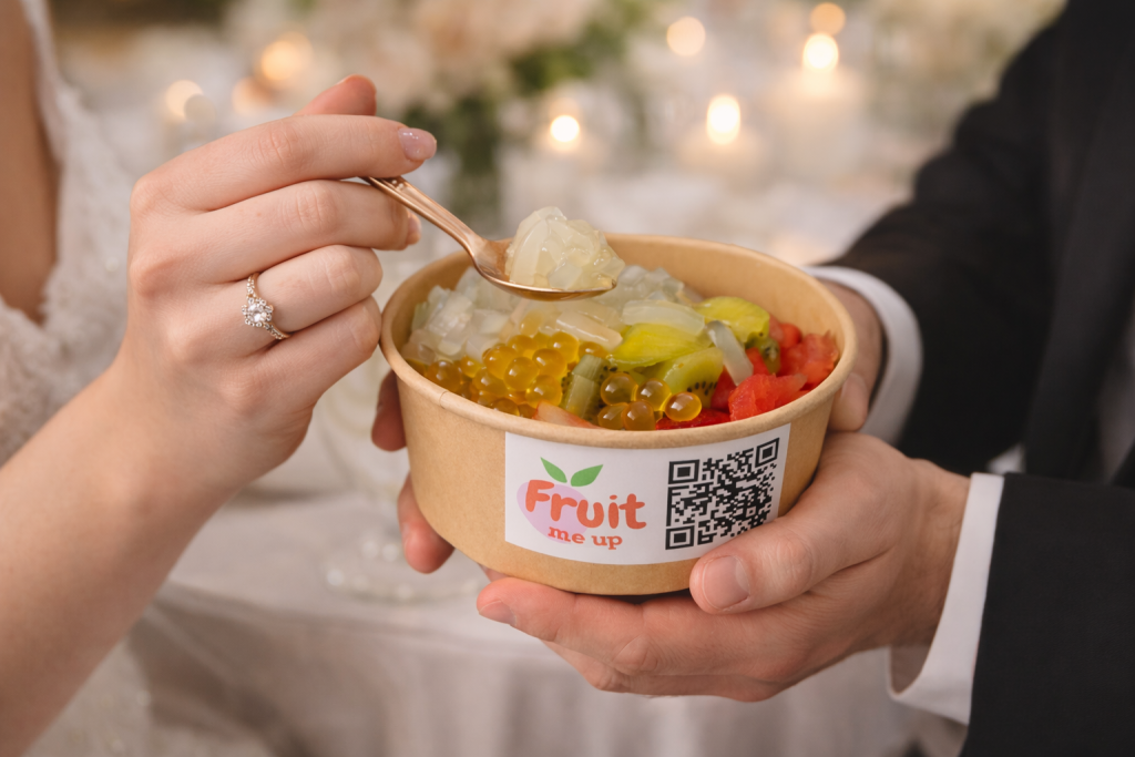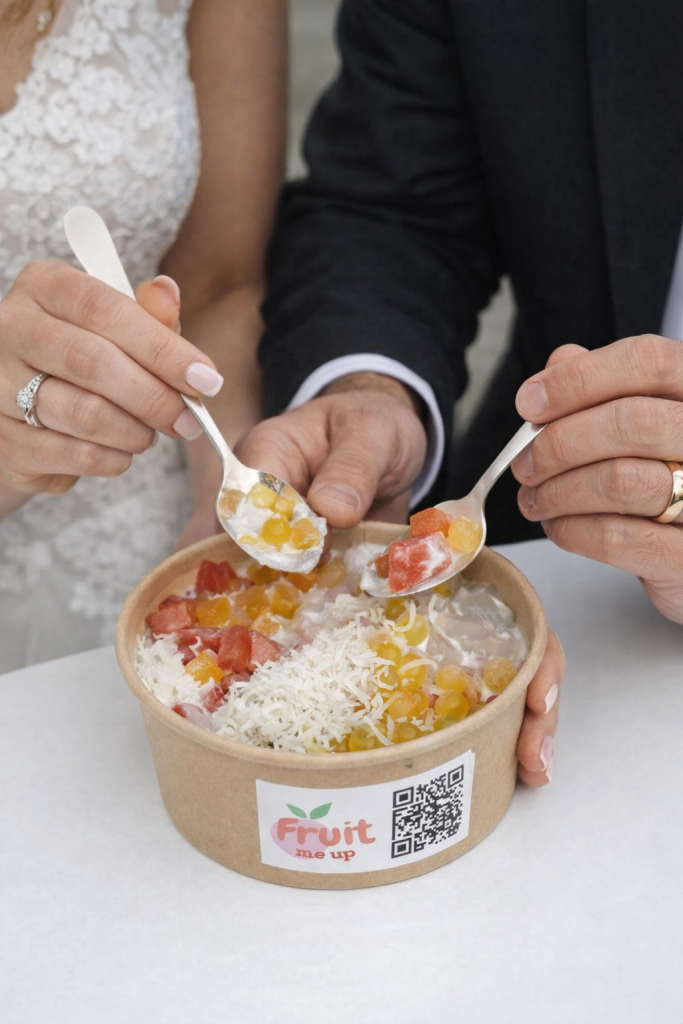 Fruit Me Up brings a premium fruit-dessert cart to weddings and special events – fresh fruit bowls garnished with boba- style toppings and drizzled with coconut milk delight all from an Instagram- worthy cart.